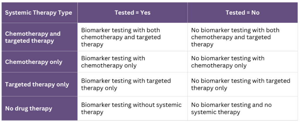 In total, the study included 167,017 patients with metastatic lung cancer, the majority of whom were aged 65 years or older (83.4%). Patients were divided into eight categories based on whether or not they received biomarker testing and which therapies they went on to receive.
