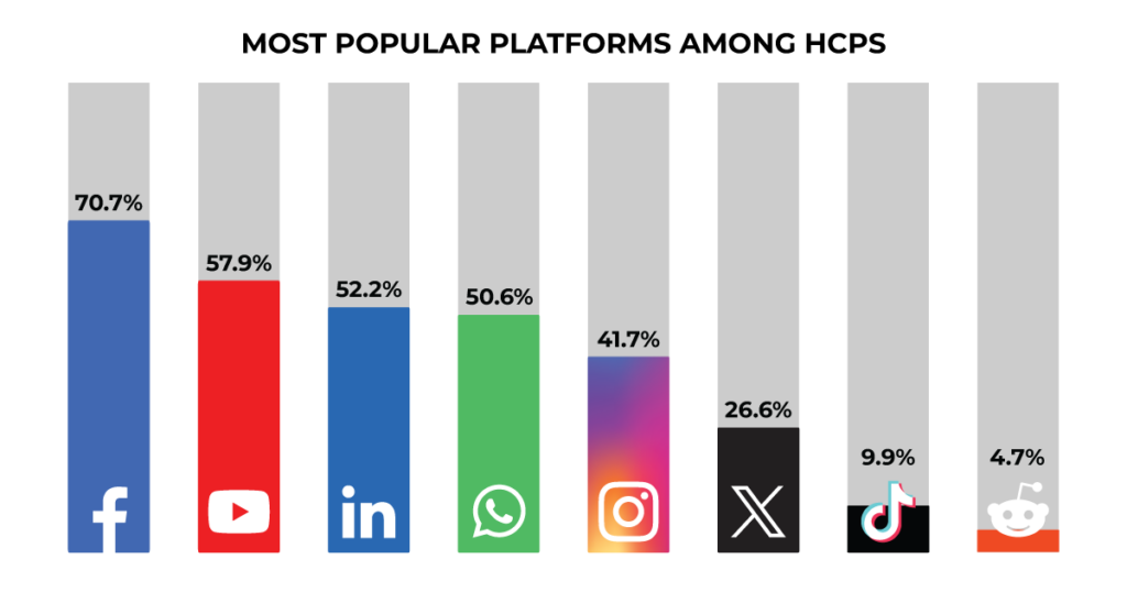 According to one study, almost three-quarters of HCPs who use social media spend at least 7 hours on these platforms each week. The most popular platforms among HCPs? Facebook (70.7%), YouTube (57.9%), LinkedIn (52.2%), WhatsApp (50.6%), Instagram (41.7%), Twitter (26.6%), TikTok (9.9%), and Reddit (4.7%).