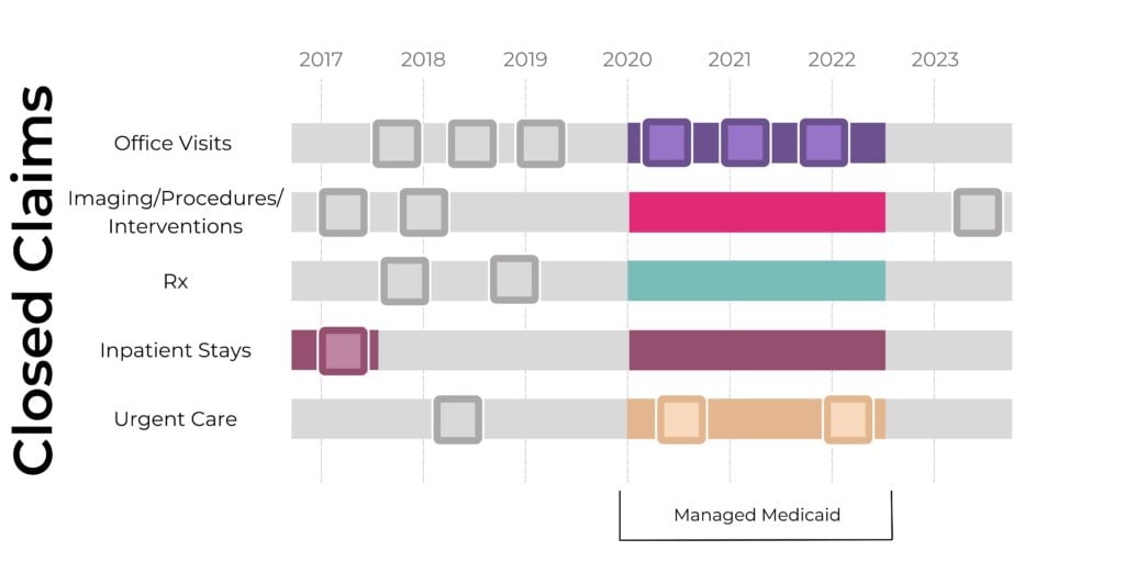 Closed claims offer a comprehensive view of patient interactions within the healthcare system during their enrollment period. For instance, if a patient is covered under an employer-provided health plan for three years, nearly all their healthcare interactions during this period will be captured if the provider is included in the closed claims dataset.