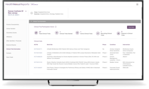 Digging into the investigator/HCP level detail provides information on their practice, affiliations, referral network, claim volumetrics, external influences, clinical trial experience and more. SDOH data is integrated at the patient, provider, and practice level.