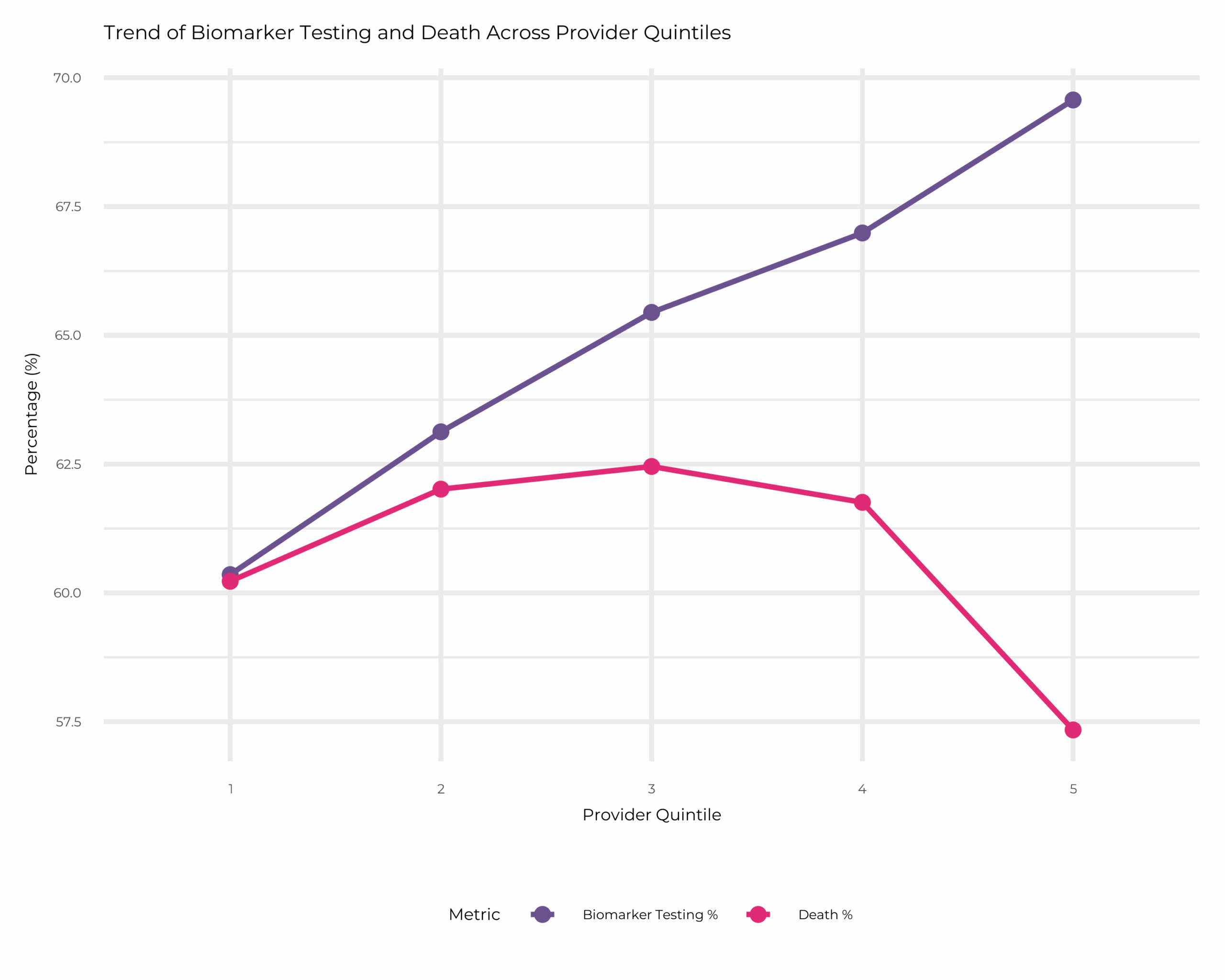 Statistical analysis using the Kruskal-Wallis test demonstrated a significant difference in biomarker testing rates across provider quintiles (p<0.0001). Post-hoc, pairwise, Dunn’s tests with Bonferroni correction confirmed significant differences between lower and higher quintiles. Notably, testing rates and mortality were relatively consistent across Quintiles 1 through 4 but showed a marked divergence in Quintile 5.