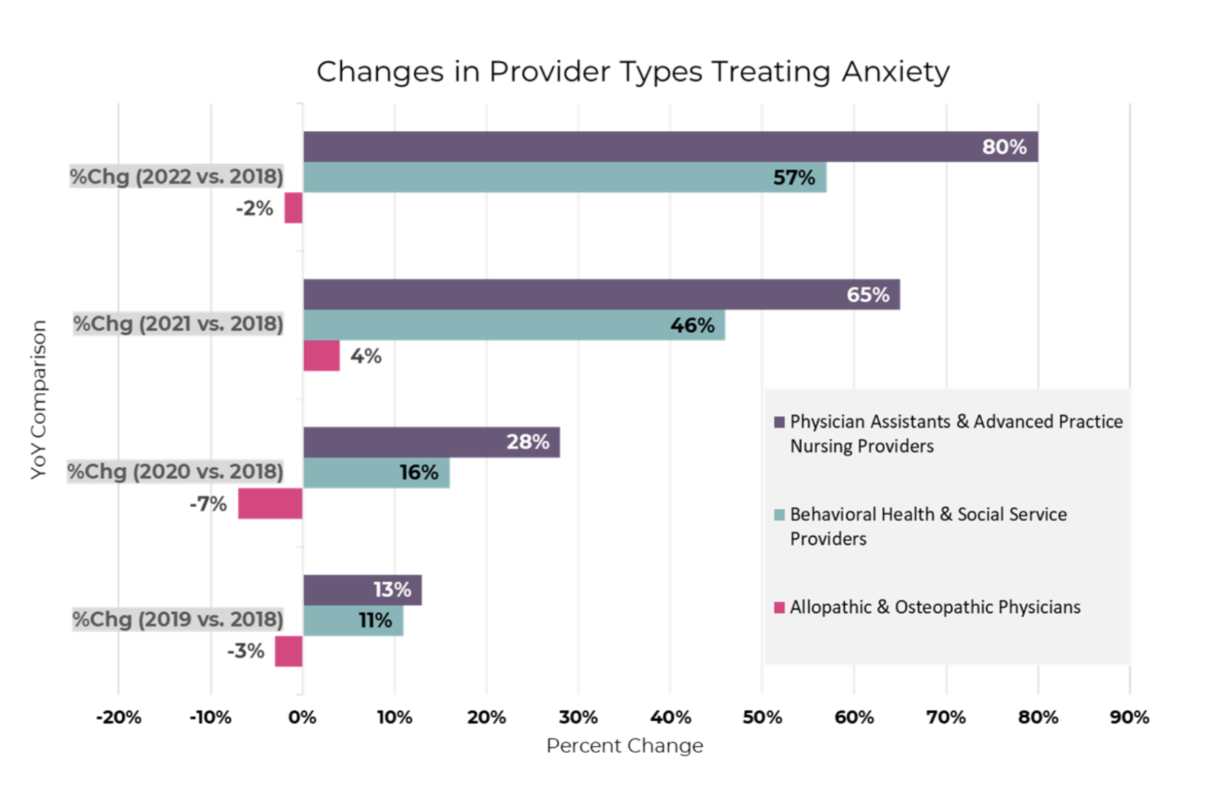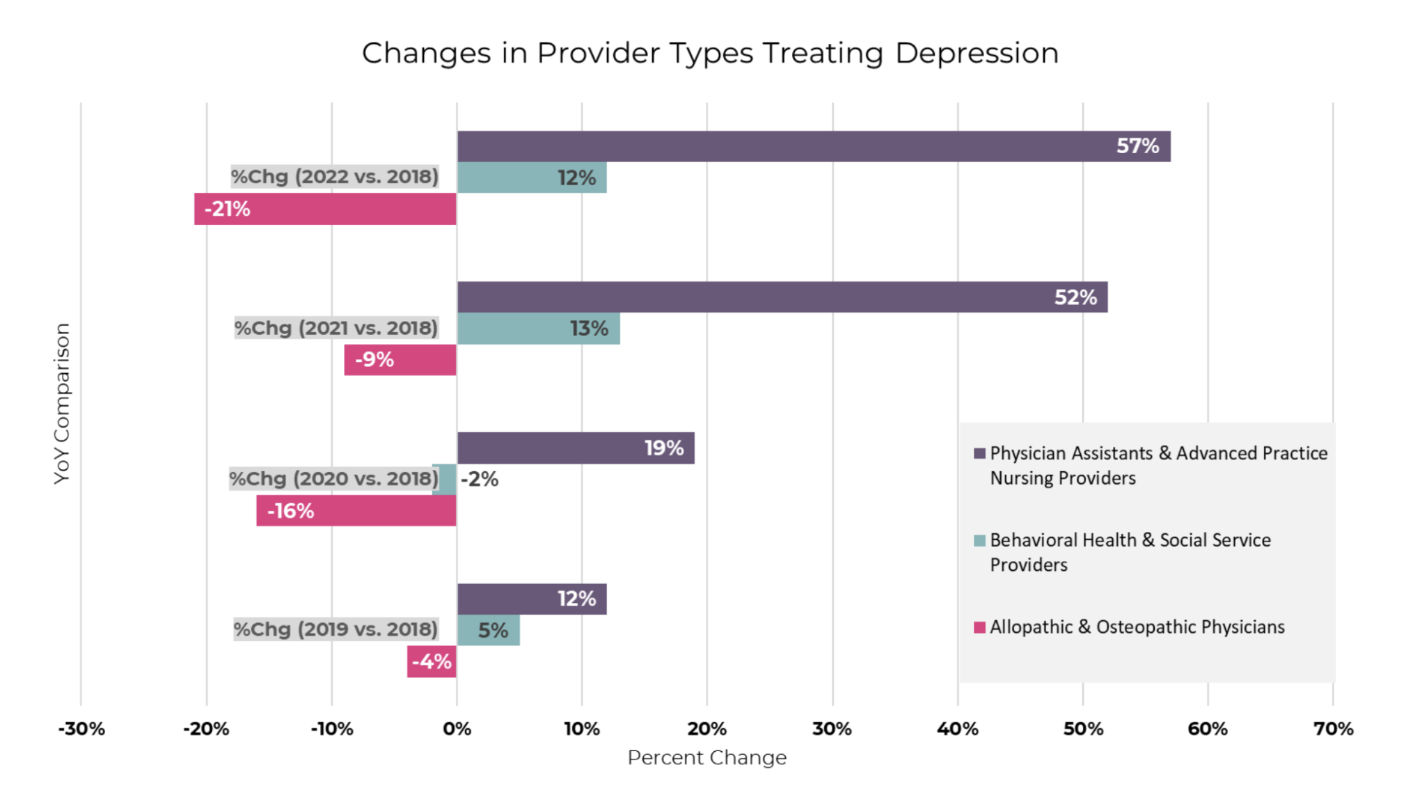 From 2018 to 2022, the data shows a consistent and potentially worrying shift. During this period, the percentage of behavioral health and social service providers treating depression and anxiety grew by 57% and 80% respectively. Even more striking, there was a compensatory shift from physician providers to extended care providers like physician assistants and advanced practice nursing providers.