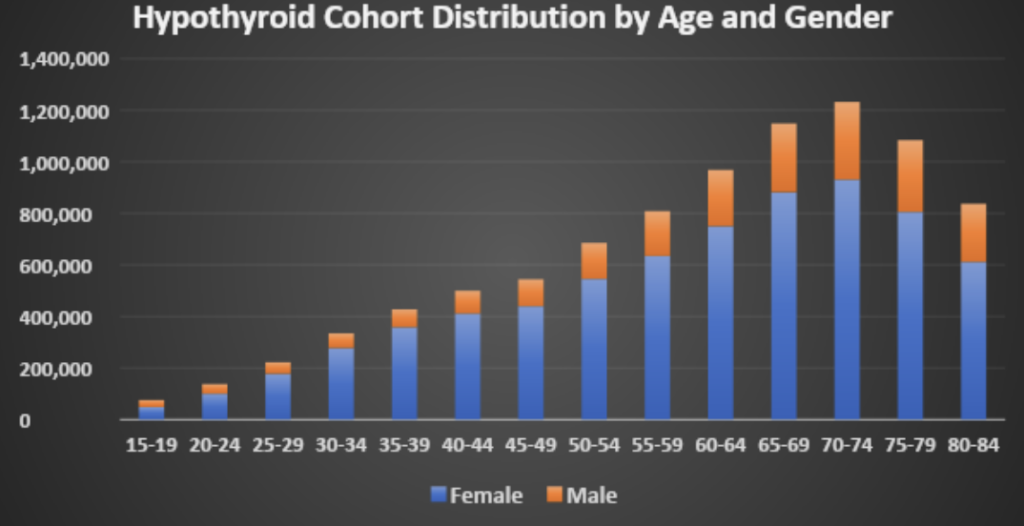 For example, thyroid problems are significantly more common in women and the rate of hypothyroidism increases with age for both men and women, as evidenced by the data from PurpleLab’s HealthNexus.