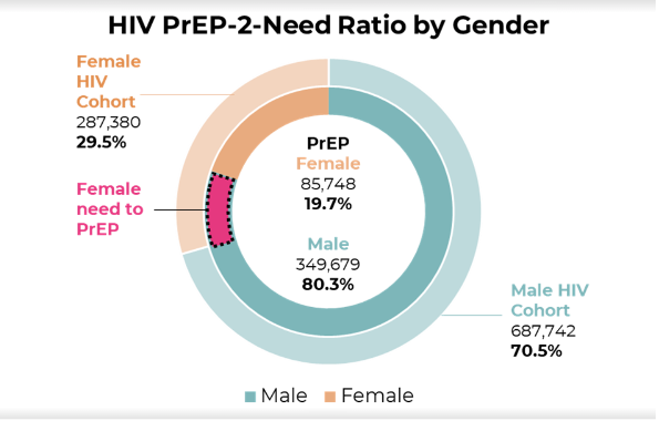 Our data shows an increase in awareness and use of PrEP related to the need for treatment, however, we found there are gaps between men and women. In this data analysis, distributions for people with an HIV diagnosis is 70.5% for men and 29.5% for women, yet men have a higher rate of PrEP, 80.3% compared to 19.7% for women. This data reinforces the need for: